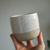 Hübscher Becher aus hellem Ton, Alle Streifen sind handgemalt und jeder Becher ein bisschen unterschiedlich.