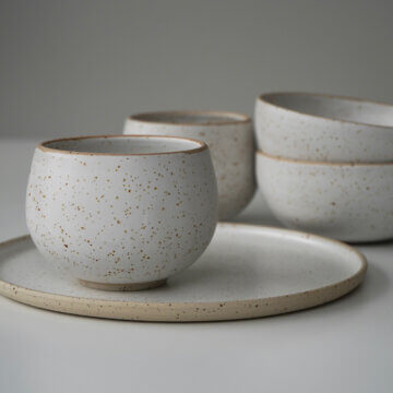 Passen zu den DOT Schalen. Glasiert in einem matten Weiss auf gepunktetem Ton. Der Rand ist unglasiert gelassen.