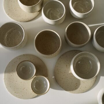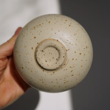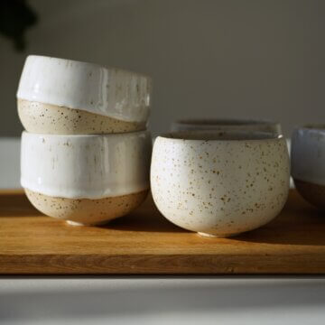 Tasse aus hellem Ton mit Pünktchen. Glasiert in einem matten Transparent.