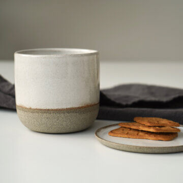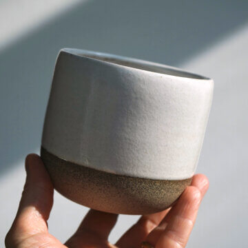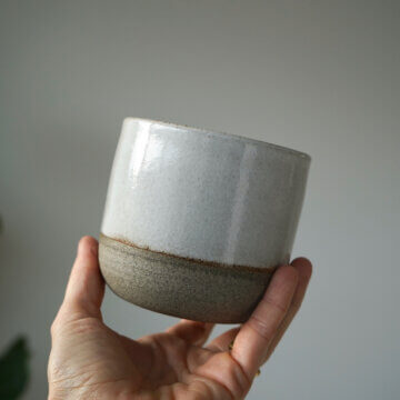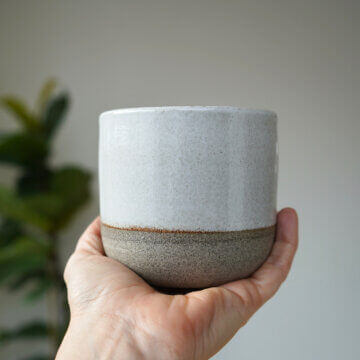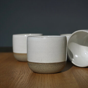 LEX runder Becher aus grauem, schamottiertem Ton. Aussen halb weiss glasiert halb unglasiert und abgeschliffen für eine angenehme Haptik, innen weiss glasiert.